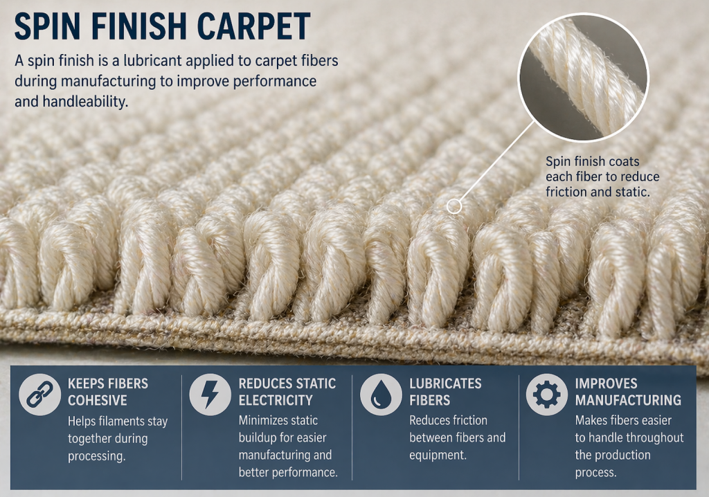 Spin finish is a term that refers to the process of adding to textile fibers during manufacturing. Manufacturers use this process to make the fibers easier to handle, no matter how they use them. In carpet manufacturing, they apply a spin finish to the fibers to keep the filaments cohesive, reduce static electricity, and lubricate the fibers during production. Fibers with this kind of finish generally process better through carpet manufacturing machines. When things operate smoothly, the production process goes faster.