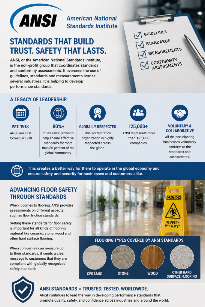 When it comes to flooring, ANSI provides assessments on different aspects, such as floor friction standards. Setting these standards for floor safety is important for all kinds of flooring material like ceramic, stone, wood, and other hard surface flooring. When companies can measure up to their standards, it sends a clear message to customers that they are compliant with globally recognized safety standards.