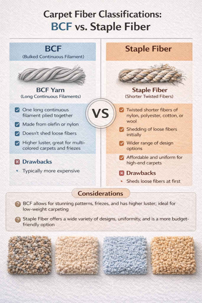 When it comes to carpet manufacturing, there are two different classifications for the fiber systems: staple yarns and BCF (bulked continuous filament). Each one provides certain advantages and disadvantages, so it’s a good idea for carpet inspectors to share that information with their clients.