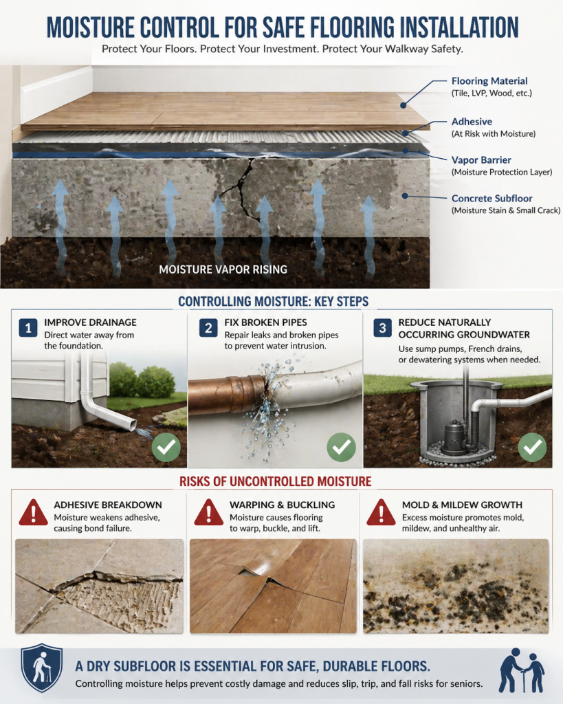 When every effort is made to take care of moisture in the concrete substrate, it will be much more likely for flooring contractors to have happy clients who don’t have to worry about ruined flooring due to moisture.