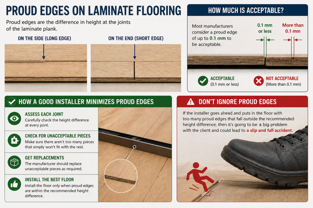 A good installer can minimize proud edges in laminate planks. They should assess each joint carefully. They should also check that there are not too many unacceptable pieces. Pieces that do not fit properly with the rest should not be installed. The manufacturer should replace unacceptable pieces as required. If the installer installs the floor with too many proud edges that exceed the recommended height difference, it will create a significant problem. This issue can lead to complaints from the client. It can also create a trip hazard and increase the risk of a slip and fall accident.
